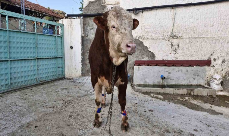 Çorum’un Alaca ilçesinde sahibi tarafından özel olarak bakılan “Paşa” adı verilen kurbanlık tosun alıcısını bekliyor.
