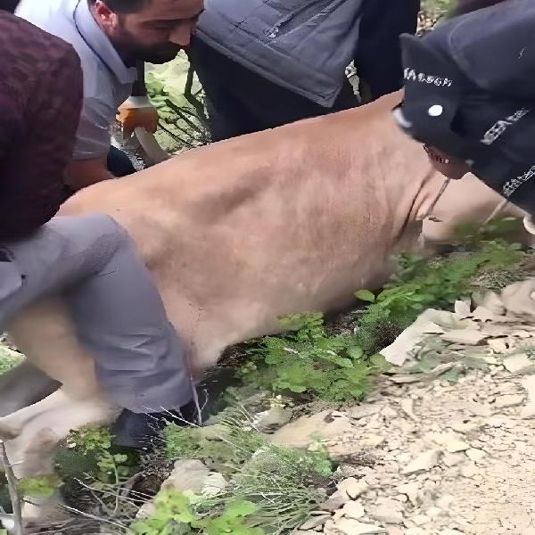 10 metreden yuvarlanan ineği köylüler kurtardı