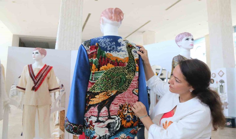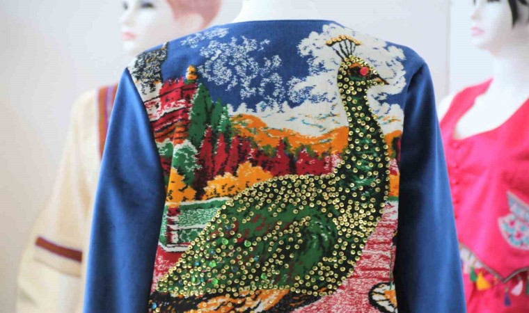Diğer taraftan 1985 yılında bir kursiyere kayınbabası tarafından hediye edilen duvar halısı günümüze uyarlanarak ceket ve etek olarak dikildi. Manken üzerinde sergilenen elbise takımı dikkat çekti. Duvar halısından ceketin yapılmasında emeği bulunan Giyim Öğretmeni Eray Yılmaz Ünlü ise, “Eski bir duvar halısını günümüze uyarlayarak ceket ve etek yaptık. Aynı zamanda tavus kuşunu da boncuklarla biraz daha belirgin hale getirdik. 1985 yılında halı kursiyerime kayınpederi tarafından hediye edilmiş. 4-5 kursiyerimle 1 haftada işlemlerini tamamladık. Alan olmak isterse 3 bin 500 TL’ye kadar alıcısı bulunur. Kursiyerim de hatıra olarak kullanmak istiyor. Hem makine hem de el işi ile yapıldı” açıklamasını yaptı.