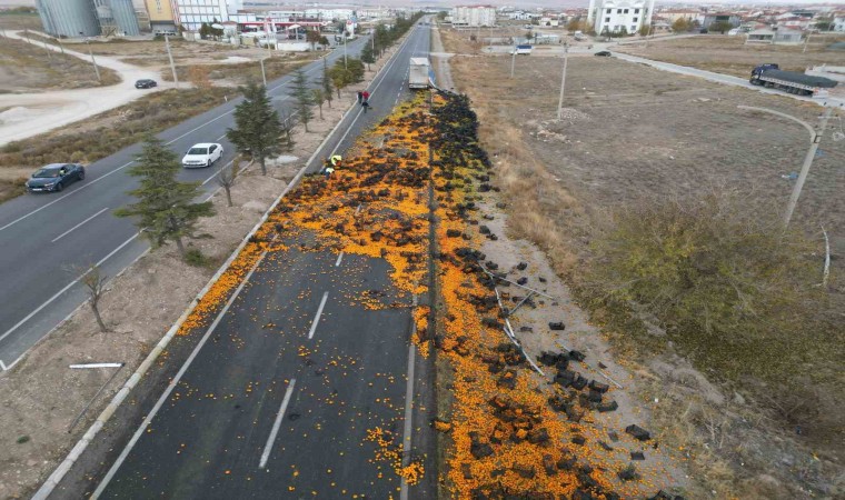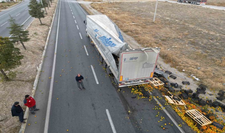 Afyonkarahisar’da kontrolden çıkarak refüje giren tırın dorsesinin açılmasından dolayı etrafa dağılan yaklaşık 10 ton mandalina, kara yolunu yarım saat trafiğe kapatırken, yol jandarma ekiplerinin yoğun uğraşları sonucu tekrar ulaşıma açıldı.