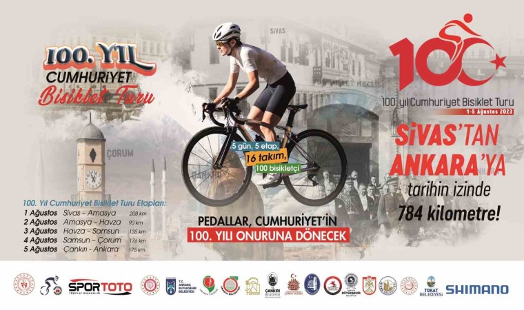 UCI kıta takımları, milli takımlar ve kulüp takımlarının katılacağı 100. Yıl Bisiklet Turu’nda; 16 takımdan 100 bisikletçi, 5 gün, 5 etap boyunca Sivas’tan Ankara’ya Cumhuriyetin yolunda tarihin izinde 784 km pedal çevirecek. Türkiye Bisiklet Federasyonu’nun organizasyonu ile düzenlenen 100. Yıl Cumhuriyet Bisiklet Turu; Cumhurbaşkanlığı, T.C. Gençlik ve Spor Bakanlığı, Spor Hizmetleri Genel Müdürlüğü, İl Valilikleri, Belediyeleri, Spor Toto Teşkilat Başkanlığı, Kamu Kurum Kuruluşları ile Shimano Türkiye’nin destekleriyle Cumhuriyetin kuruluş adımlarının atıldığı Sivas Atatürk ve Kongre Müzesi önünden 1 Ağustos, salı günü start alacak. 100. Yıl Bisiklet Turu; Amasya, Havza, Samsun, Çorum, Çankırı üzerinden 5 Ağustos, cumartesi günü Ankara’da Cumhuriyet’in kurulduğu 1. Türkiye Büyük Millet Meclisi’nin önünde son bulacak.