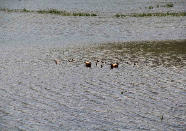 ESKİŞEHİR’İN, TEPEBAŞI İLÇESİNDE BULUNAN KESKİN BARAJI GÖLETİ’NDE 11 YAVRUSUYLA BİRLİKTE YÜZEN ANGUTLAR HOŞ MANZARALAR OLUŞTURDU. YAŞAMINI GÖLETTE SÜRDÜREN KUŞLAR, SICAK HAVANIN TADINI ÇIKARDI. DİĞER HAYVANLARIN AKSİNE TEK EŞLİ OLAN ANGUT ÇİFTİNİN YAVRULARINA BUĞDAY, MISIR YA DA YEŞİLLİK GİBİ YİYECEKLER ARADIĞI GÖRÜLDÜ. MART AYINDA ÜREME DÖNEMİNE GİREN SEVİMLİ YABANİ KUŞLARIN HALLERİ FOTOĞRAFLANDI.