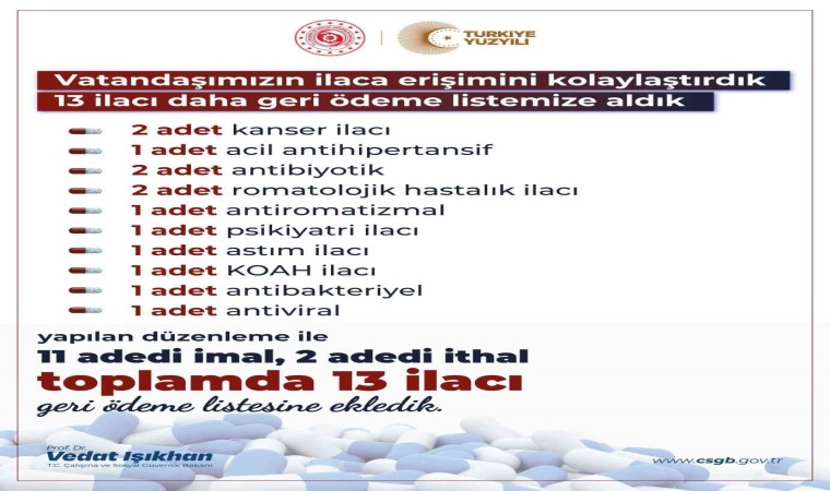 Çalışma ve Sosyal Güvenlik Bakanı Vedat Işıkhan, Sosyal Güvenlik Kurumunun Bedeli Ödenecek İlaçlar Listesinde yapılan düzenleme ile 11’i yerli üretim olmak üzere 13 ilacı daha geri ödeme listesine aldıklarını duyurdu.
