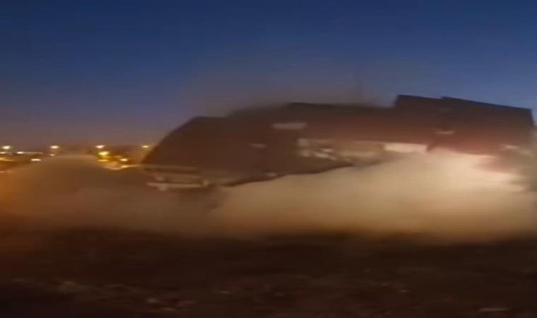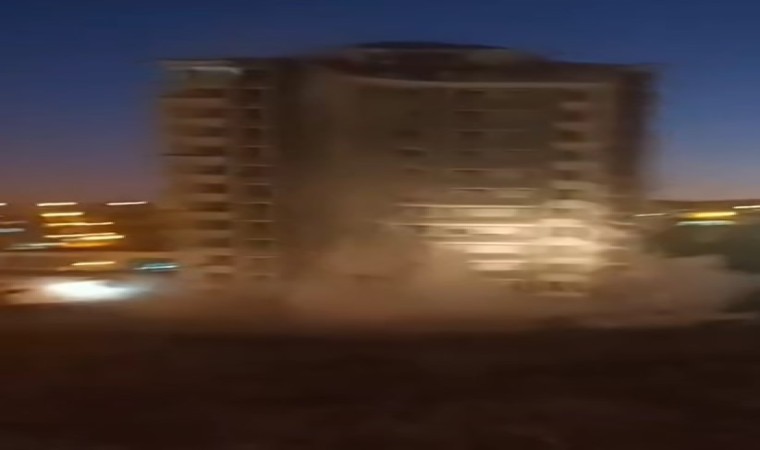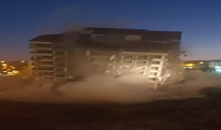 Hatay’ın Antakya ilçesinde, depremde zarar gören 16 katlı binanın kontrollü olarak iş makinesiyle yıkılma anı kameralara yansıdı.