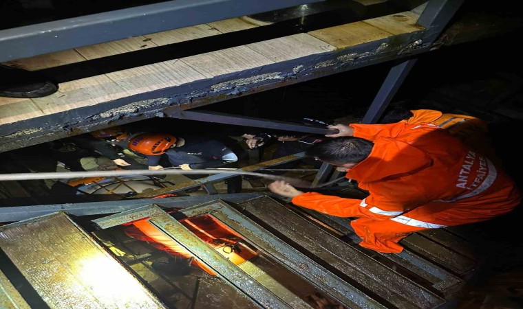 Antalya’da bir otelin aşçıbaşı zeminin kırılması sonucu iskelenin alt kısmına düştü. Yaralanan 180 kilogram ağırlığındaki ahçıbaşını çıkarmak için itfaiye, AFAD ve sağlık ekipleri seferber oldu.