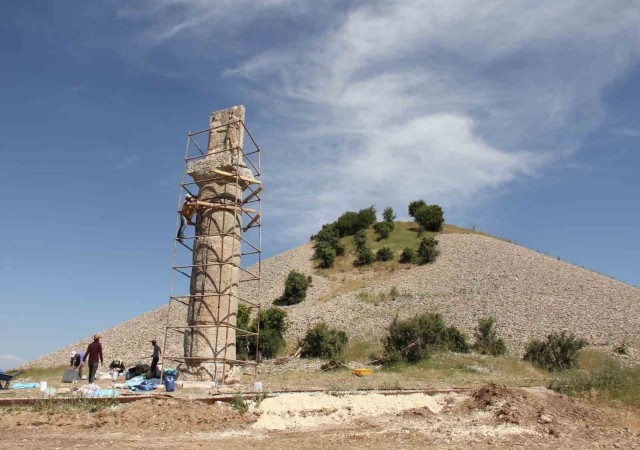 Restorasyon çalışmaları hakkında bilgi veren Hacı Bayram Veli Üniversitesi Güzel Sanatlar Bölüm Başkanı Prof. Dr. Yaşar Selçuk Şener, "Öncelikle sütunlardaki hasarları tespit ettik. Sonra yapılacak işleri planladık ve çalışmalara başladık. Taşları yeniden sıraya dizerek onarımları gerçekleştirdik. Kırılan parçaların tamamlanmasının ardından sütunları yerine yerleştirdik. Bu süreçte özellikle sütunun çökmesine neden olan eksik bir parça vardı. Yerel kaynaklardan bir taş getirip işledik ve eksik kısmı tamamladık. Daha sonra kaideyi güçlendirdik ve sütunlar ile kabartmalardaki hasarların onarımlarına geçtik. Restorasyon işlemi tamamlandıktan sonra parçaları tekrar yerine monte ettik" şeklinde açıklamalarda bulundu.