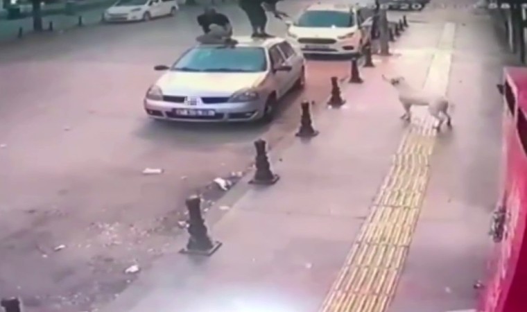 Gaziantep’te 2 genç, yolda yürüdükleri esnada kendilerine saldırmak isteyen köpekten park halindeki aracın üzerine çıkarak kurtuldu. O anlar ise çevredeki bir güvenlik kamerasına yansıdı.
