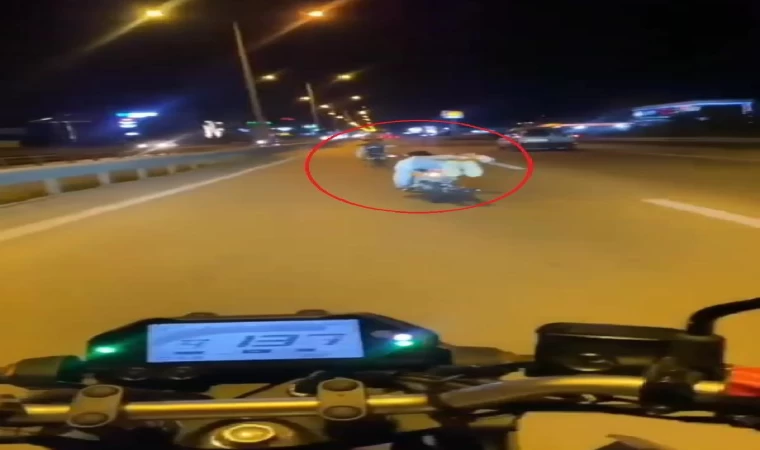 Bursa-Ankara kara yolu İnegöl girişinde gece saatlerinde 2 sürücü, motosikletlerinin üzerine yüzüstü yatıp, yarıştı. Seyir halindeki araçları sollayarak, yakın mesafede yollarına devam eden motosikletlilerin tehlikeli sürüşü, bir başka motosiklet sürücüsü tarafından cep telefonu kamerasıyla kayda alındı. (DHA)