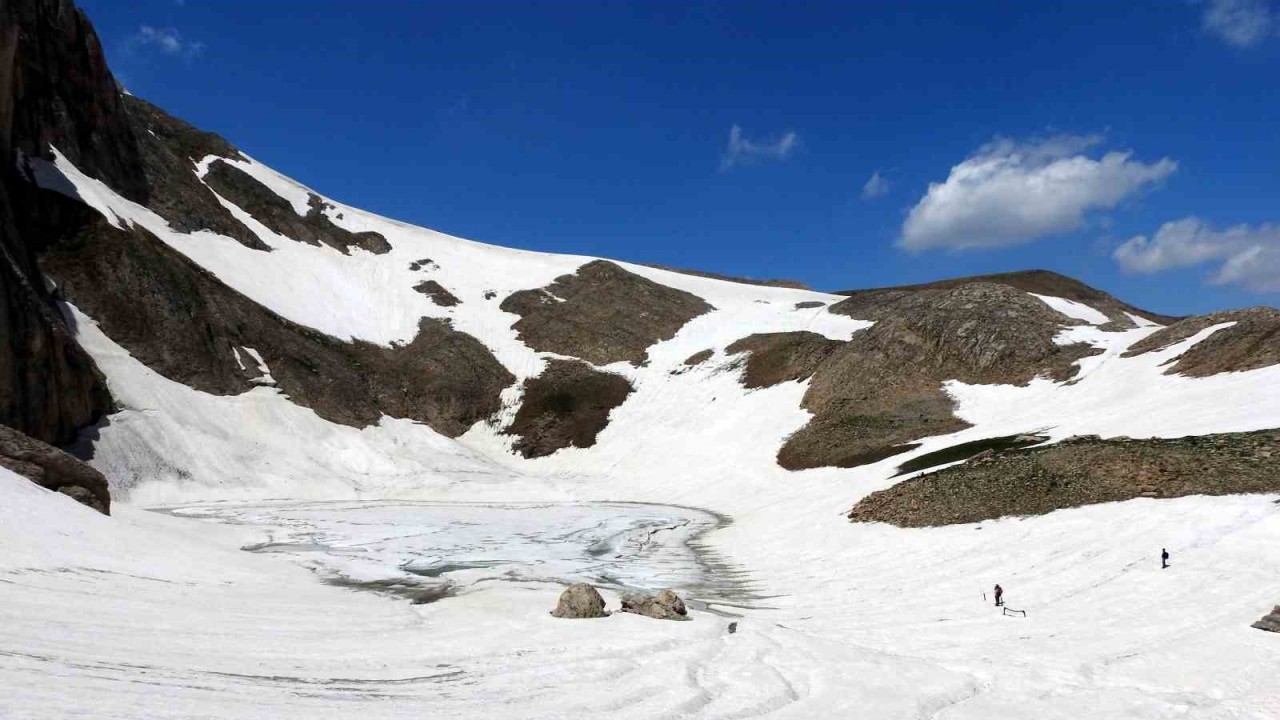 Ekim ayı olmasına rağmen zirvede büyük kar kütlelerinin de bulunduğu alana ulaşan trekking yapan vatandaşlardan Abbas Yıldız, buzulların muhteşem olduğunu belirtti.