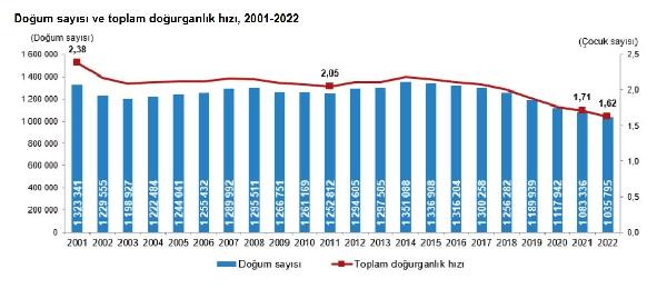 Türkiye İstatistik Kurumu (TÜİK), 2022 yılına ilişkin doğum istatistiklerini açıkladı. Buna göre; 2022 yılında 1 milyon 35 bin 795 bebek doğumu gerçekleşti. Bebeklerin yüzde 51,4'ü erkek, yüzde 48,6'sı kız oldu. 15-49 yaş grubundaki bir kadının doğurabileceği ortalama çocuk sayısını ifade eden toplam doğurganlık hızı; 2001 yılında 2,38 çocukken; 2022 yılında 1,62 çocuk olarak gerçekleşti.