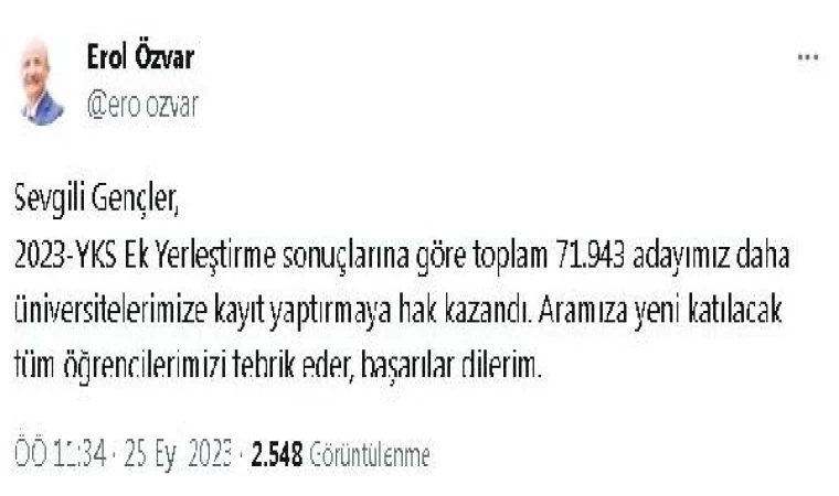 Yükseköğretim Kurulu (YÖK) Başkanı Erol Özvar, sosyal medya hesabından yaptığı açıklamada, "Sevgili gençler, 2023-YKS ek yerleştirme sonuçlarına göre toplam 71 bin 943 adayımız daha üniversitelerimize kayıt yaptırmaya hak kazandı. Aramıza yeni katılacak tüm öğrencilerimizi tebrik eder, başarılar dilerim" dedi. (DHA)
