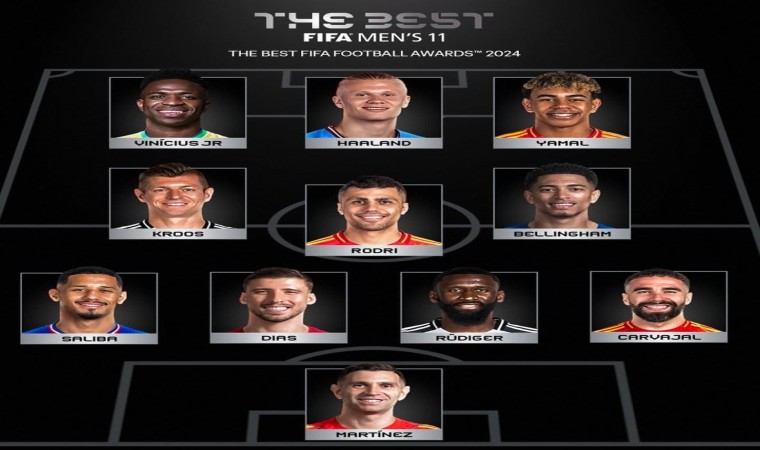 En İyi Erkek 11: Emiliano Martinez, Dani Carvajal, Antonio Rüdiger, Ruben Dias, William Saliba, Rodri, Toni Kroos, Jude Bellingham, Lamine Yamal, Vinicius Junior, Erling Haaland