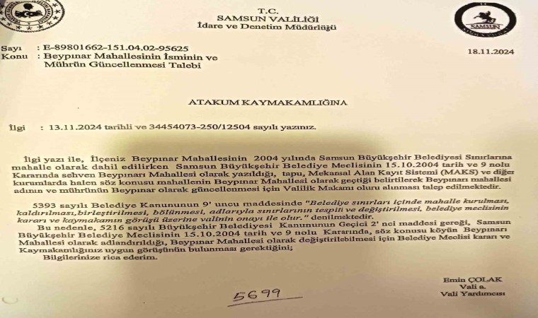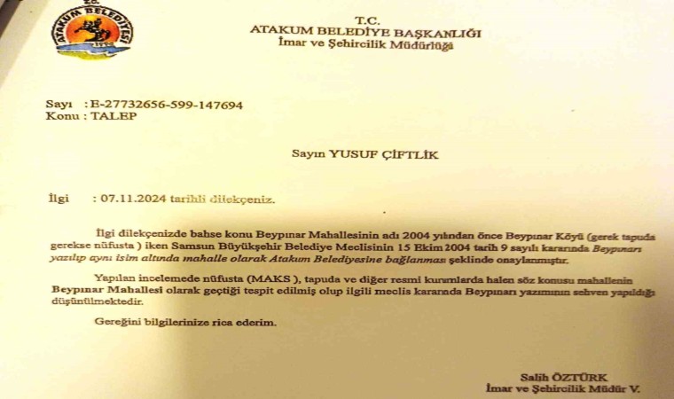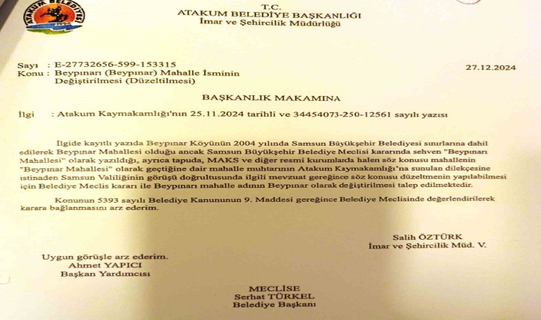 Samsun’un Atakum ilçene bağlı “Beypınar” Mahallesi’nin 2004’te meclisten geçen kararda adının “Beypınarı” şeklinde yazılması nedeniyle yaşanan karışıklığın önüne geçilmesi için ilçe meclisinde harekete geçildi.