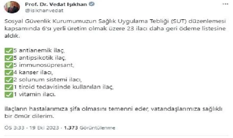 ANKARA, (DHA)- ÇALIŞMA ve Sosyal Güvenlik Bakanı Vedat Işıkhan, Sosyal Güvenlik Kurumu'nun (SGK) Sağlık Uygulama Tebliği'nde yapılan değişiklikle, 23 ilacın daha geri ödeme listesine alındığını duyurdu.
