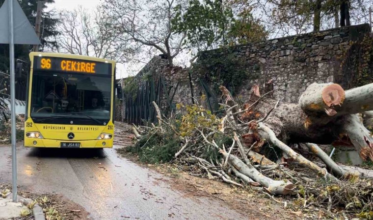 Bursa’da 510 yıllık geçmişi bulunan tarihi Hüsnügüzel Kaplıcası’nın bahçesindeki 250 yıllık anıt çınar ağacı fırtınaya dayanamadı. Saatteki hızı 95 kilometreye ulaşan fırtına sebebiyle devasa çınar kökünden koparak yola devrildi. Ekipler ağacın dallarını keserek trafiği açtı .