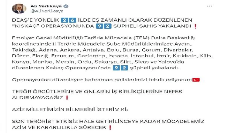 ANKARA, (DHA)- İÇİŞLERİ Bakanı Ali Yerlikaya, DEAŞ’e yönelik 26 ilde eş zamanlı düzenlenen ’Kıskaç’ operasyonunda 92 şüphelinin gözaltına alındığını açıkladı.