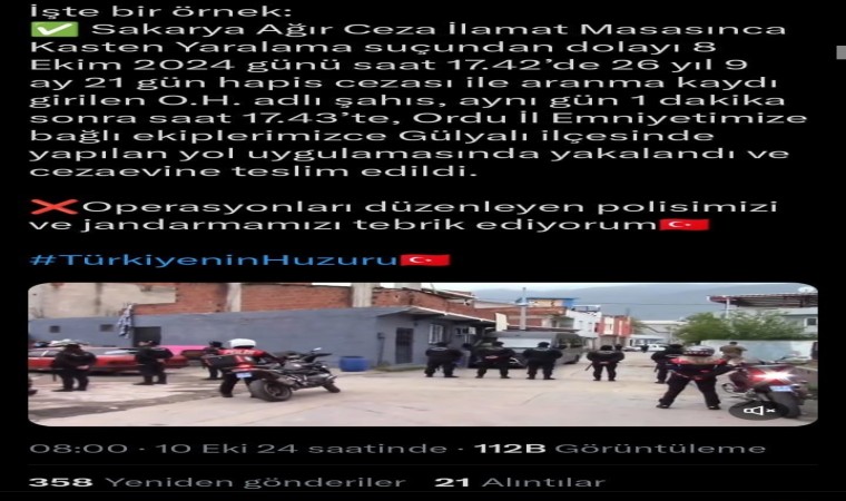 İçişleri Bakanı Ali Yerlikaya, sosyal medya hesabından yaptığı paylaşımda, “Sakarya Ağır Ceza İlamat Masasınca kasten yaralama suçundan dolayı 8 Ekim 2024 günü saat 17.42’de 26 yıl 9 ay 21 gün hapis cezası ile aranma kaydı girilen O.H. adlı şahıs, aynı gün 1 dakika sonra saat 17.43’te, Ordu İl Emniyetimize bağlı ekiplerimizce Gülyalı ilçesinde yapılan yol uygulamasında yakalandı ve cezaevine teslim edildi” ifadelerine yer verdi.