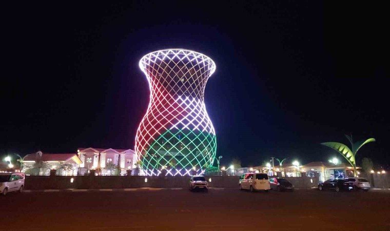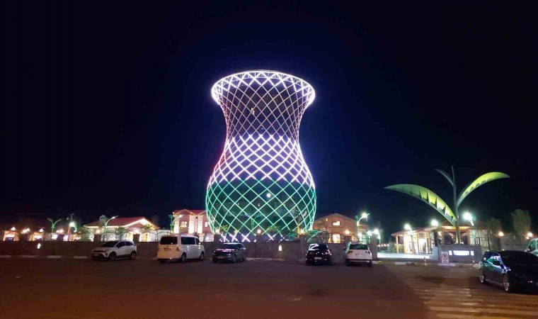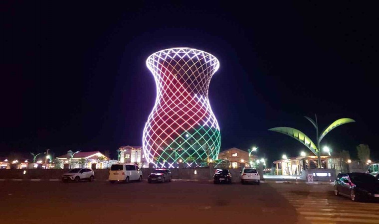 Rize’nin 29 metrelik çay bardağına Filistin bayrağı yansıtıldı.