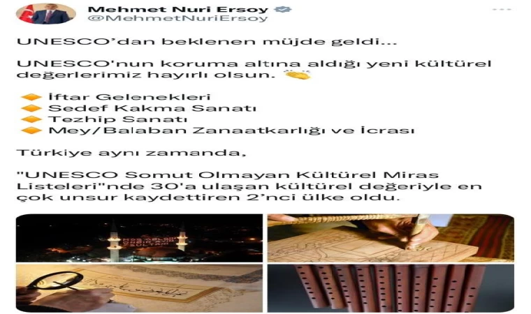 Bakan Ersoy, zeytin yetiştiriciliğinin dün listeye kaydedilmesinin ardından yeni unsurların da bugün UNESCO’ya dahil olmasını 'UNESCO'dan beklenen müjde geldi' notuyla sosyal medyada paylaşım yaparak duyurdu. Ersoy, "UNESCO'nun koruma altına aldığı yeni kültürel değerlerimiz hayırlı olsun. İftar Gelenekleri, Sedef Kakma Sanatı, Tezhip Sanatı, Mey/Balaban Zanaatkarlığı ve İcrası. Türkiye aynı zamanda, 'UNESCO Somut Olmayan Kültürel Miras Listeleri'nde 30'a ulaşan kültürel değeriyle en çok unsur kaydettiren 2'nci ülke oldu." ifadelerini kullandı. (DHA)