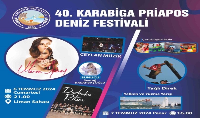 Karabiga Belediyesi’nin düzenlemiş olduğu Karabiga Priapos Deniz Festivali her yıl temmuz ayının ilk haftası kutlanıyor. Bu yıl da 06-07 Temmuz 2024 tarihlerinde çeşitli etkinlikler ile kutlanacak festivalde ünlü sanatçı Merve Özbey’de sahne alacak. 6 Temmuz Cumartesi günü saat 21.00’da Karabiga Liman Sahasında gerçekleştirilecek konserde ünlü sanatçı Merve Özbey’in yanı sıra Bigalı Kardeşler Grubu ve Darbuka Ritim Grubu da sahne alacak. 7 Temmuz Cumartesi günü ise yağlı direk yarışması, yelken gösterisi ve yüzme yarışmaları yapılacak.