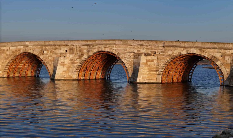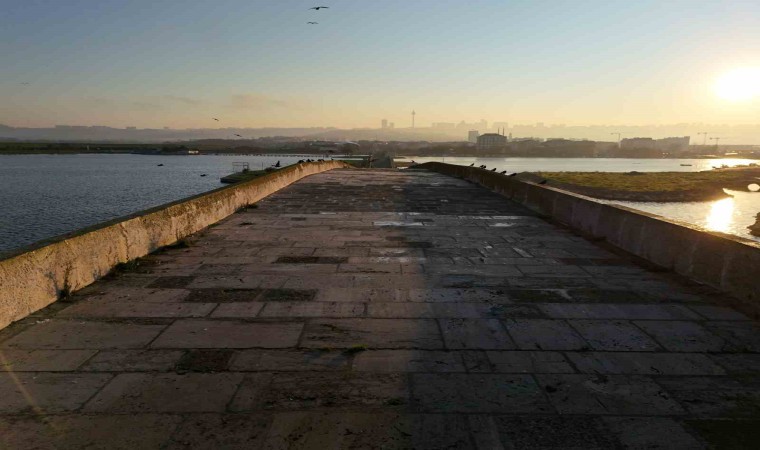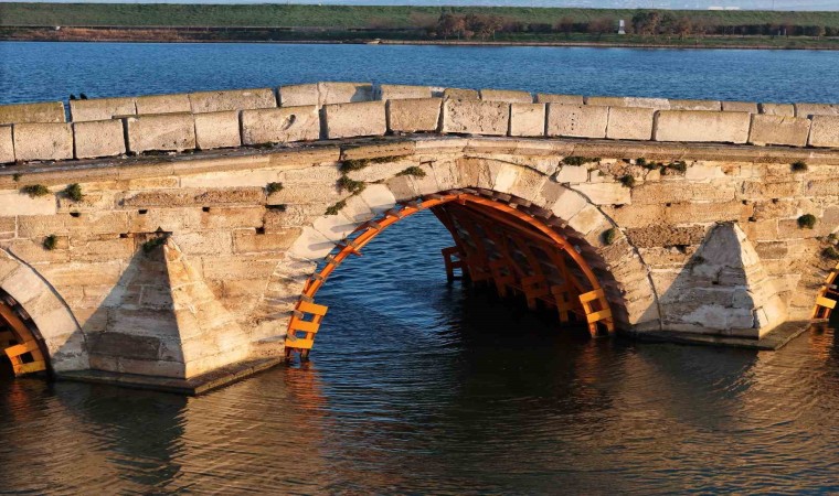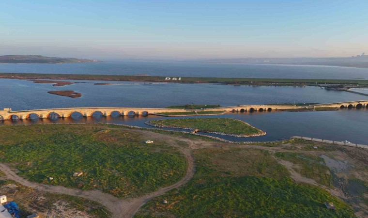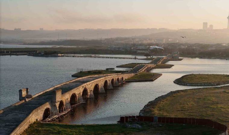 Büyükçekmece’deki Osmanlı mirası Kanuni Sultan Süleyman Köprüsü’nde 2022 yılında başlanılan restorasyon çalışmalarına devam ediliyor. Mimar Sinan’ın ‘şaheserimdir’ dediği köprü hakkında konuşan Tarihçi Zafer Bilgi, “Köprünün restorasyonun bitirilmesi ve bir an önce tarihi şahidenin hem gelecek kuşaklara kazandırılması hem de aynı sağlamlığı ve görkemi bozulmadan onarılması çok önem arz ediyor. Üzerinden Mimar Sinan’ın geçtiğini düşündüğünüzde, siz de tekrar o köprüyü kullandığınızda, sizi alıp tarihin derinliklerine ulaştırabiliyor” dedi. 28 kemerin altına demir kazıkların çakıldığı 450 yıllık köprü, havadan görüntülendi.