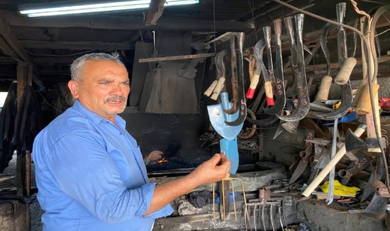 Osmaniye’nin Düziçi ilçesinde sıcak demir ustalığı yapan 59 yaşındaki Adem Kekik, 12 yaşında başladığı mesleğini severek devam ettiriyor. Unutulmaya yüz tutmuş meslekler arasında yer alan demir dövme ustalığını hala yaşatmaya çalışan Kekik, artık çırak yetişmediğini, meslekteki son ustalardan olduğunu dile getirdi. Mesleğini sıcak havaya rağmen ateşin başında yorulmadan sürdüren Kekik, ısıttığı kızgın demiri örs üzerinde çekiçle döverek balta, orak ve köylülerin siparişi üzerine çeşitli ürünlere dönüştürüyor.