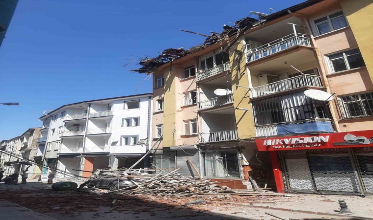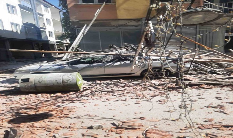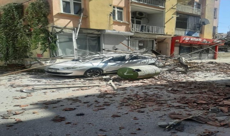 Bölgedeki bir güvenlik kamerasına da yansıyan olayda, çatının park halindeki aracın üstüne düşüşü ve yoldan geçen bir başka taksiye de zarar verdiği görülüyor.