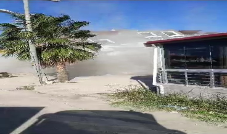 Hatay’ın Arsuz ilçesinde iş makinasıyla yıkılan 5 katlı binanın yerle bir olma anı cep telefonu kamerasına yansıdı.