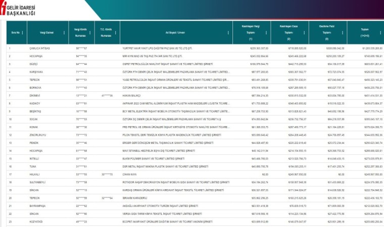 Yayımlanan listelerde 1 Haziran 2023 ile 31 Mayıs 2024 tarihleri arasında kesinleşen ve toplam miktarı 5 milyon lirayı aşan tarhiyatların bulunduğu I-A listesinde 1 milyar 265 milyon 539 bin 269 lirayla Yurtpet Akaryakıt Ltd. Şti. birinci sırada, 740 milyon 699 bin 196 lirayla Mir Kıym. Mad. ve Tai. Ltd. Şti. ikinci sırada, 603 milyon 831 bin 261 lirayla Ospet Petrolcülük üçüncü sırada, 526 milyon 7 bin 902 lirayla Öztürk FTH Demir Çelik İnşaat Malzemeleri Sanayi Ticaret Limited Şirketi dördüncü sırada, 490 milyon 323 bin 145 lirayla Yuse Petrolcülük İnşaat Orman Ürünleri ve Tekstil Sanayi Ticaret Limited Şirketi ise beşinci sırada yer aldı.