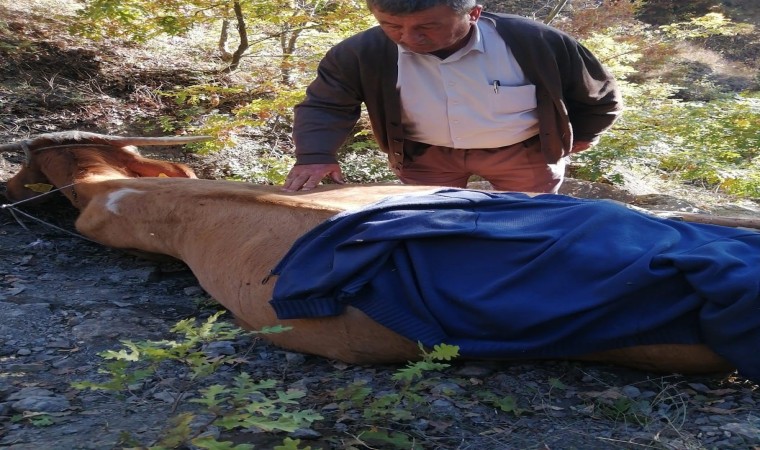 Kastamonu’nun Hanönü ilçesinde yaklaşık 50 metrelik uçuruma yuvarlanan büyükbaş hayvan, 11 saatlik çalışmanın ardından kurtarılabildi.