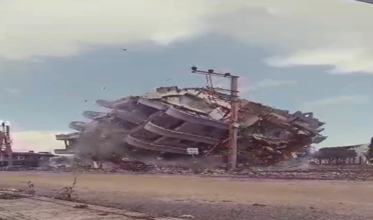 Hatay’ın Antakya ilçesinde kontrollü olarak yıkılan 6 katlı binanın yerle bir olma anı kameraya yansıdı.