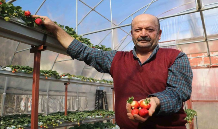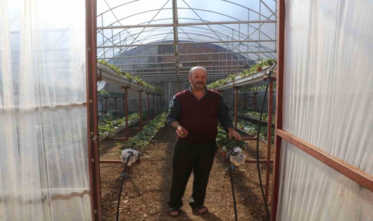 Hatay’da deneme amaçlı evinin bahçesine kurduğu 60 metrekarelik serada çilek üretmeyi başaran çiftçi Abdullah Yıldırım, ilk hasadını yaptı.