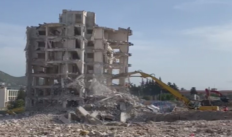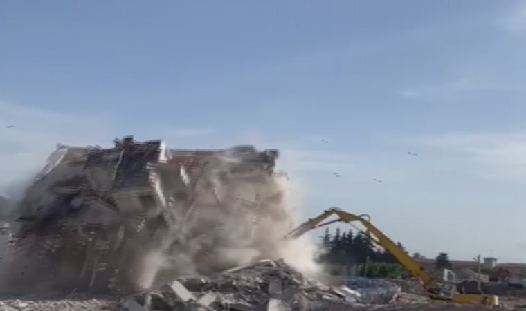 Hatay’ın Antakya ilçesinde kontrollü olarak yıkılan 7 katlı binanın yerle bir olma anı kameraya yansıdı.
