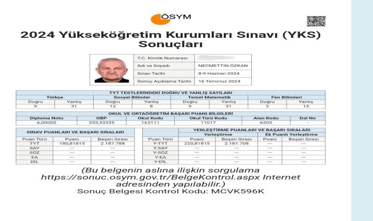 Bursa’nın İnegöl ilçesinde girdiği YKS’de yerleştirme puanıyla birlikte 220 puan alan 70 yaşındaki Necmettin Özkan, tercih yapmadı. Başka bir adayın önüne geçerek engel olmayı istemediğini söyleyen Özkan, torununu teşvik etmek amacıyla YKS’nin ilk oturumu Temel Yeterlilik Testi’ne (TYT) girmişti.
