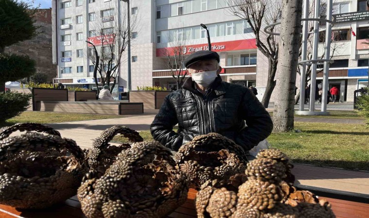 Bolu’da 79 yaşındaki Mustafa Kor, tel ile örerek yaptığı kozalak sepetlerini sokaklarda satarak geçimini sağlıyor.