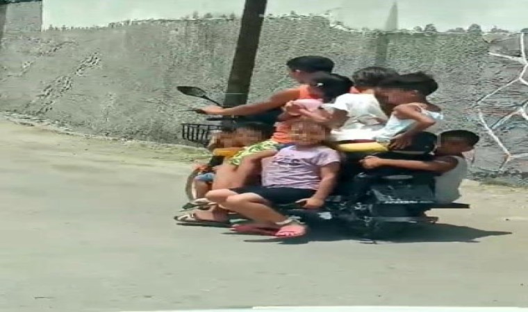 Hatay’ın Erzin ilçesinde çocuk sürücünün kullandığı elektrikli motosiklete 8 çocuğun bindiği anlar cep telefonu kamerasına yansıdı.