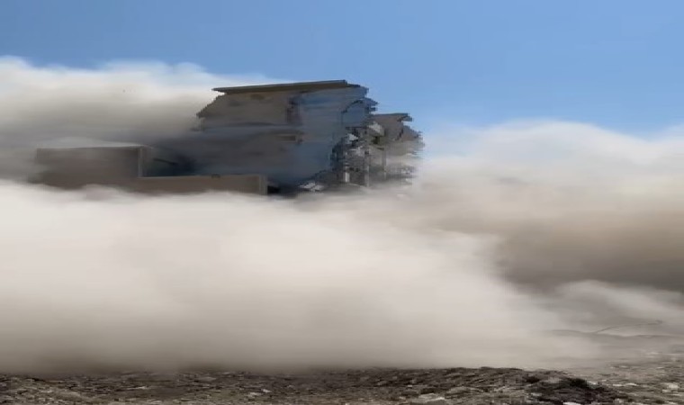 Hatay’ın Antakya ilçesinde 8 katlı binanın iş makinesinin dokunuşuyla kontrollü olarak yerle bir olduğu anlar kameraya yansıdı.