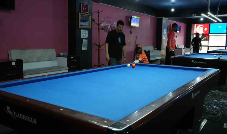 Akyazı ilçesinde ikamet eden 8 yaşındaki Eymen Özbaş, babasının salonunda bilardo öğreniyor. Yaşıtları parklarda oynarken minik Eymen okul çıkışlarında hedefi olan dünya şampiyonluğu için ıstakasıyla antrenman yapıyor. 2 yıldır bilardo oynadığını belirten 8 yaşındaki Özbaş, “Hedefim dünya şampiyonu olmak. Buraya yaşıtlarım da geliyor onlarla antrenman yapıyorum. Üç bant oynuyorum. Babam bu bilardoyu öğretti sağ olsun. Benim için büyük bir avantaj başlattı. Kendisine çok teşekkür ediyorum. Bu bilardoyu da zaten babam sayesinde öğrendim. Babam öğretmeseydi ben şu an hiç spor dalı bilmiyordum. Büyünce dünya şampiyonu olacağım. Sahneye de çıkabilirsem babamı da araya katacağım çünkü onun sayesinde öğrendim ve antrenörüm. Ülkemi gururla temsil edeceğim” dedi.