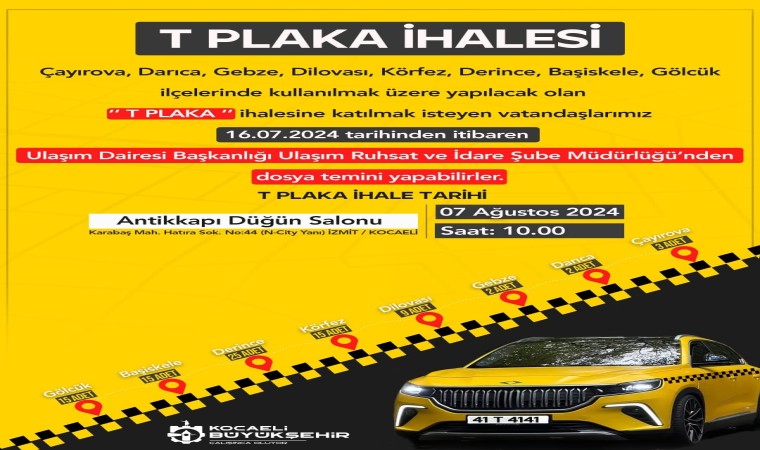 Kocaeli Büyükşehir Belediyesi, 8 ilçede 86 T plaka için 7 Ağustos Çarşamba günü ihale yapacak.