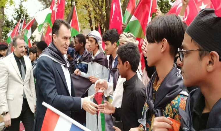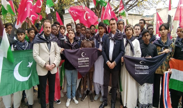 Bursa’da 89 farklı ülkeden 155 öğrencinin eğitim gördüğü proje okulu Osmangazi Belediyesi Uluslararası Murad Hüdavendigar Anadolu İmam Hatip Lisesinin öğrencileri, İsrail’in Filistin’e saldırılarını kınadı. Ülkelerine ait yöresel kıyafetlerini giyen çok sayıda öğrenci, Tophane Meydanı’ndaki Osman Gazi Türbesi önünde bir araya geldi.