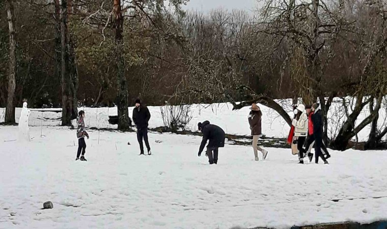 Bolu’nun doğa harikası Abant Gölü Milli Parkı’nda kar yağışı başladı. Geçtiğimiz hafta etkili olan kar yağışıyla birlikte kar kalınlığının 15 santimetreye ulaştığı bölgede tatilciler, kar topu oynayarak karın tadını çıkardı.