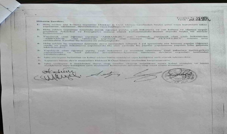 “Hibe edilen taşınmaz, başka şahıslara veya kurumlara devredilemez, satılamaz veya özelleştirilemez. Taşınmazda yalnızca öğrenci yurdu, yaşlı bakımevi veya yer kalması halinde arkeoloji ve etnografya müzesi yapılabilir. Başka amaçlarla kullanılmasına izin verilmeyecek. Yapılacak olan öğrenci yurduna ve yaşlı bakımevine "Abbasigil" ismi verilecek, müzeye ise "Mir Zeynelbey" ismi verilecektir. Aile, arazinin devrinden itibaren 5 yıl içinde öğrenci yurdu ve yaşlı bakımevinin tamamlanmasını talep etti. Bu sürede projeler tamamlanmazsa, hibe geçersiz sayılacak. Öğrenci yurdu, yaşlı bakımevi ve müzenin işletmesi özel şahıslara veya şirketlere devredilemeyecek, tamamen devletin organları tarafından yürütülecek. Tüm devir masrafları Hakkari İl Özel İdaresi tarafından karşılanacak. Sözleşme, tüm maddeleriyle birlikte tapu kütüğüne işlenerek taraflarca imzalandı.”