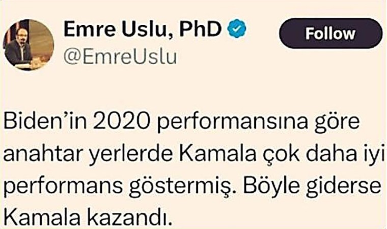 Firari örgüt mensubu Emre Uslu, 5 Kasım öncesinde Kamala Harrıs’in seçimi kazanacağı yönünde bir paylaşım yapmıştı. Seçim sonuçları açıklanmaya başlayınca ve sonuçlar beklentilerinin tersi çıkınca Emre Uslu X paylaşımını hemen sildi.