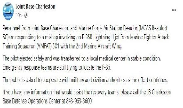 Charleston Hava Kuvvetleri Üssü’nden yapılan açıklamada, “Charleston Hava Kuvvetleri Üssü ve Beaufort Deniz Piyadeleri Hava İstasyonu (MCAS Beaufort SC) personeli, F-35B Lightning II jetinin karıştığı bir kazaya müdahale ediyor. Pilot fırlatma koltuğuyla güvenli bir şekilde uçaktan atlamış ve durumu stabil olarak yerel bir tıp merkezine nakledilmiştir. Acil müdahale ekipleri halen F-35'in yerini tespit etmeye çalışmaktadır. Çalışmalar devam ederken halktan askeri ve sivil yetkililerle işbirliği yapmaları istenmektedir. Kurtarma ekiplerine yardımcı olabilecek herhangi bir bilgiye sahipseniz, lütfen JB Charleston Üssü Savunma Operasyonları Merkezini arayın” denildi.
