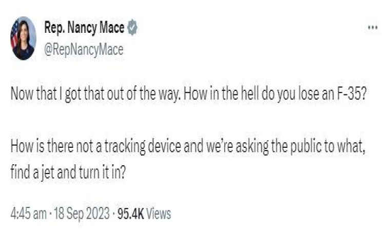 ABD Temsilciler Meclisi Üyesi Nancy Mace, sosyal medya hesabından yaptığı paylaşımda, “Nasıl olur da bir F-35'i kaybedersiniz? Nasıl olur da bir takip cihazı olmaz ve halktan ne istiyoruz? Uçağı bulup teslim etmelerini mi?” ifadelerini kullandı.