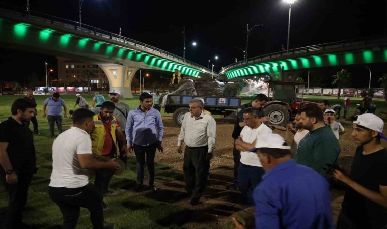 Şanlıurfa Büyükşehir Belediye Başkanı Zeynel Abidin Beyazgül, Abide Kavşağı'ndaki Park ve Bahçeler Daire Başkanlığı ekiplerinin rulo çim serme çalışmalarını sahada inceledi. Şanlıurfa'nın ulaşım sorununa önemli bir çözüm getiren Abide Kavşağı Viyadükleri'nin açılışını gerçekleştiren Başkan Beyazgül, gece geç saatlere kadar çalışan ekiplerin çimlendirme çalışmalarını denetledi.