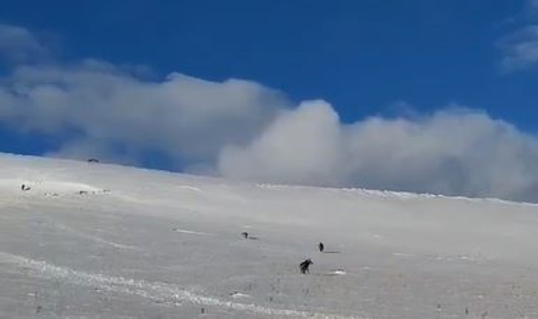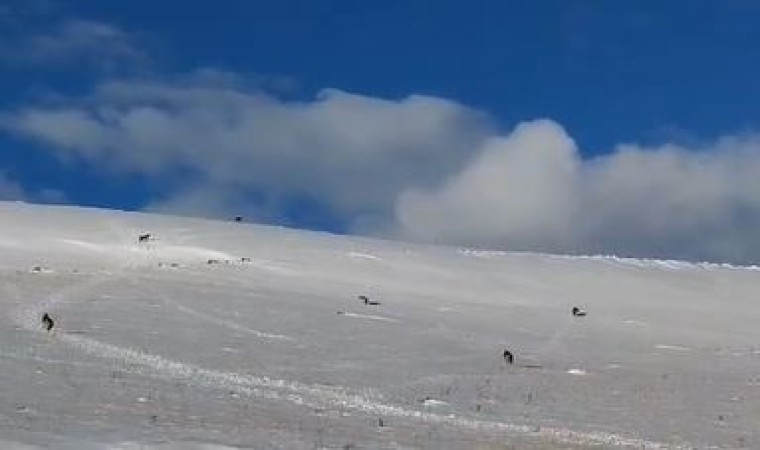 Görüntülenen 9 kurt, köpeklerin havlamasıyla Kocaköy köyü dağlık alanına doğru karla kaplı arazide ilerleyerek gözden kayboldu.
