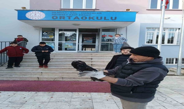 Denizli’de karne bekleyen öğrencilerin önüne kuzgun düştü. Yapılan tedavisinin ardından doğaya salınan kuzgunun açlıktan düştüğü değerlendiriliyor.