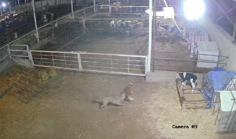 Kayseri’de aç kurdun büyükbaş hayvan çiftliğini basarak danaya saldırdığı anlar güvenlik kamerasına yansıdı.