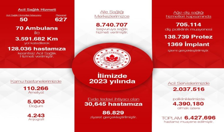 Aydın’da Acil Sağlık Hizmetleri kapsamında ise il genelindeki 50 Acil Sağlık İstasyonu ve 627 personelle hizmet verilirken 2023 yılında 70 ambulans ile 3 milyon 591 bin 682 kilometre yol kat ederek 128 bin 36 hastaya kesintisiz Acil Sağlık Hizmeti verildi. Aile Sağlığı Merkezleri tarafından 8 milyon 740 bin 707 başvuruya sağlık hizmeti verildi. Ağız-diş sağlığı hizmetleri kapsamında 705 bin 114 diş poliklinik muayenesi, 136 bin 739 protez, bin 369 implant işlemi gerçekleştirildi. Kamu hastanelerinde 110 bin 266 ameliyat, 5 bin 903 doğum ve 4 bin 243 anjiyografi yapıldı. Evde tedavi ihtiyacı olan 30 bin 645 hastaya ise 86 bin 829 ziyaret gerçekleştirildi.